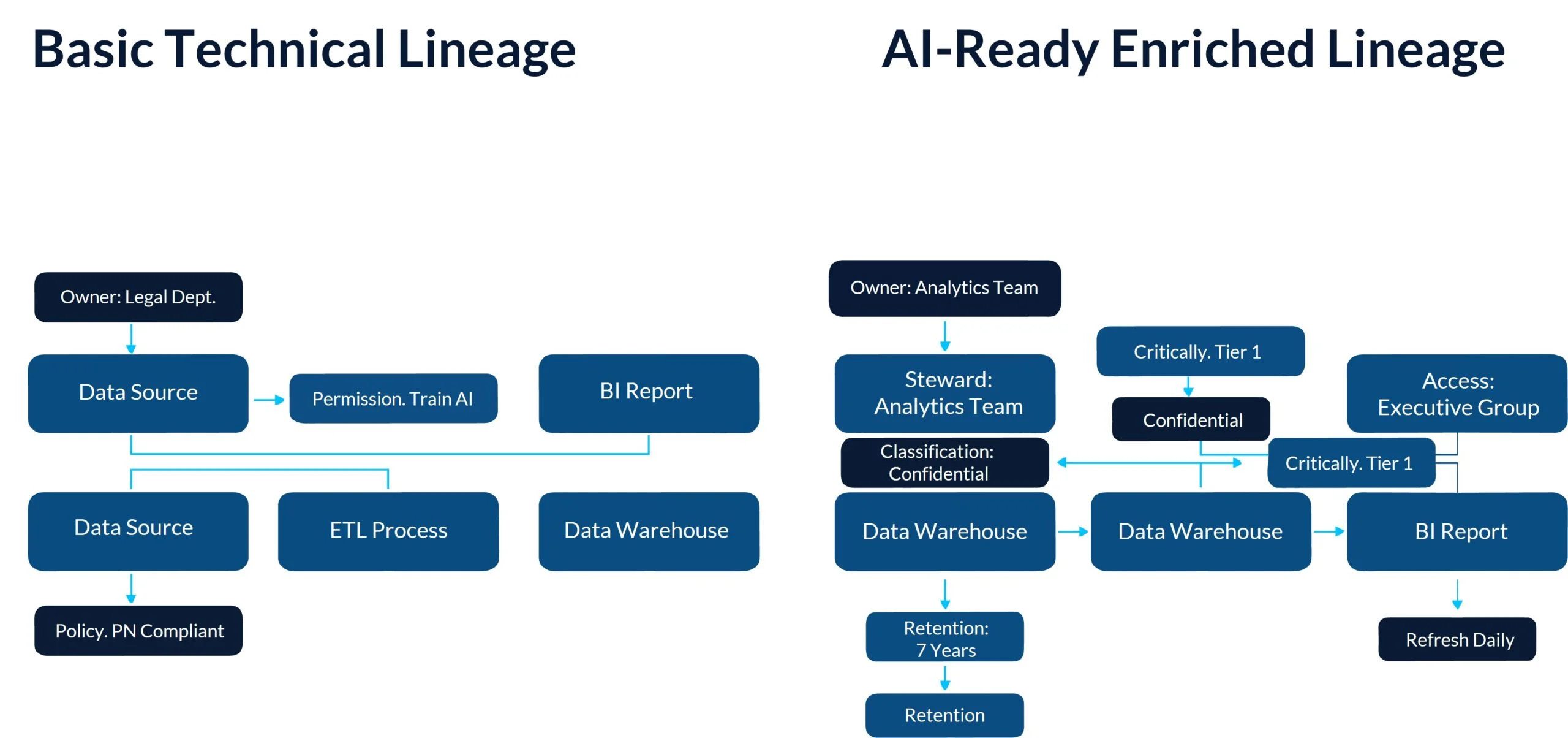 Basic lineage shows table A connects to table B. AI governance requires answers to: Who owns this data? What policies govern it? Can we use it for AI training? What business process depends on it? What are the costs and SLA commitments?