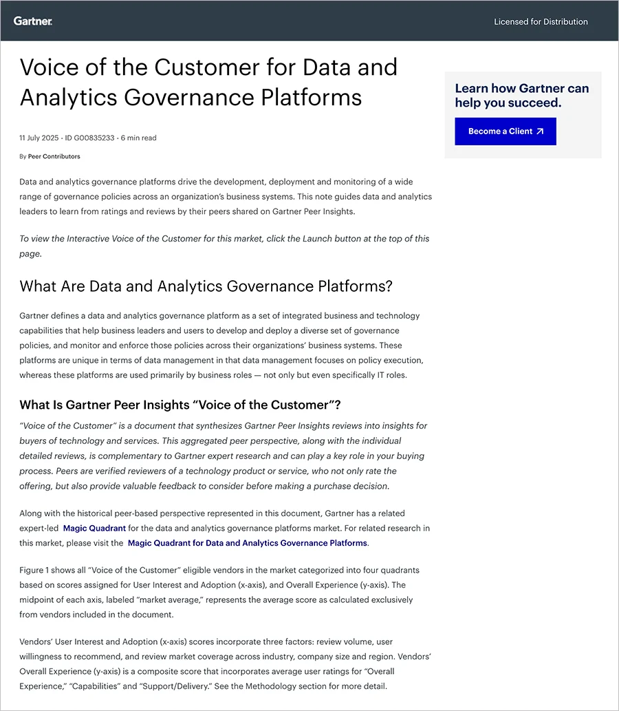 Gartner, Voice of the Customer for Data and Analytics Governance Platforms, Peer Community Contributor, 11 July 2025